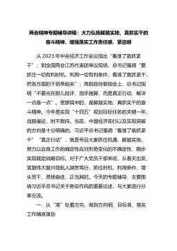 两会精神专题辅导讲稿:大力弘扬脚踏实地、真抓实干的奋斗精神,增强落实工作责任感、紧迫感从2023年中央经济工作会议指出“看准了就抓紧干”;到全国两会江苏代表团审议现场,总书记强调“要抓住一切有利时机,利用一切有利条件,看准了就抓紧干,把各方面的干劲带起来”;再到政协联组会上,总书记指明“不要光在那儿批评、指手画脚,而是真正行动,解决一点是一点”。贯穿其中的,是脚踏实地、真抓实干...