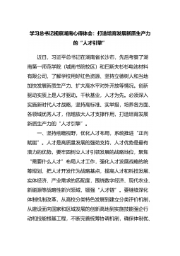 学习总书记视察湖南心得体会:打造培育发展新质生产力的“人才引擎”近日,习近平总书记在湖南省长沙市,先后考察了湖南第一师范学院(城南书院校区)和巴斯夫杉杉电池材料有限公司,了解学校用好红色资源、坚持立德树人和当地加快发展新质生产力、扩大高水平对外开放等情况。创新驱动实质上是人才驱动。千秋基业,人才为先。必须深入实施新时代人才战略,坚持高标准、实举措,培养各方面、各领域优秀人才,倍增...