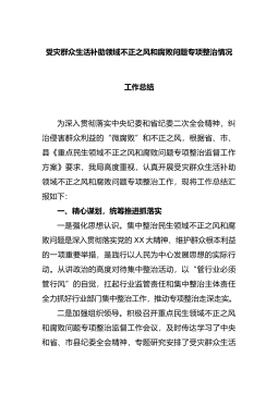 受灾群众生活补助领域不正之风和腐败问题专项整治情况工作总结为深入贯彻落实中央纪委和省纪委二次全会精神,纠治侵害群众利益的“微腐败”和不正之风,根据省、市、县《重点民生领域不正之风和腐败问题专项整治监督工作方案》要求,我局高度重视,认真开展受灾群众生活补助领域不正之风和腐败问题专项整治工作,现将工作总结汇报如下:一、精心谋划,统筹推进抓落实一是强化思想认识。集中整治民生领域不正之风...