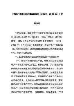 《中新广州知识城总体发展规划(2020—2035年)》实施方案为贯彻落实《国务院关于中新广州知识城总体发展规划(2020—2035年)的批复》(国函〔2020〕119号)精神,确保《中新广州知识城总体发展规划(2020—2035年)》各项目标任务落地落实,推动中新广州知识城(以下简称知识城)建设成为具有全球影响力的国家知识中心,制定本实施方案。一、打造粤港澳大湾区国际科技创新中心重要引擎(...