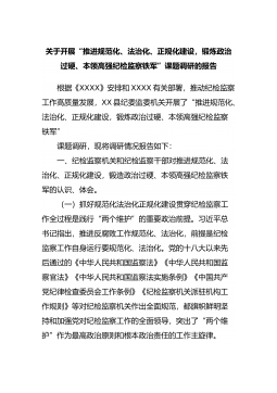 关于开展“推进规范化、法治化、正规化建设,锻炼政治过硬、本领高强纪检监察铁军”课题调研的报告根据《XXXX》安排和XXXX有关部署,推动纪检监察工作高质量发展,XX县纪委监委机关开展了“推进规范化、法治化、正规化建设,锻炼政治过硬、本领高强纪检监察铁军”课题调研,现将调研情况报告如下:一、纪检监察机关和纪检监察干部对推进规范化、法治化、正规化建设,锻造政治过硬、本领高...
