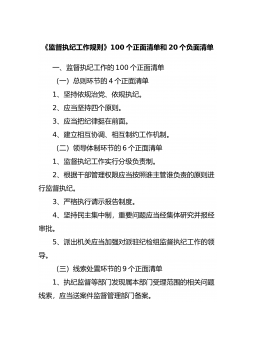 《监督执纪工作规则》100个正面清单和20个负面清单一、监督执纪工作的100个正面清单(一)总则环节的4个正面清单1、坚持依规治党、依规执纪。2、应当坚持四个原则。3、应当把纪律挺在前面。4、建立相互协调、相互制约工作机制。(二)领导体制环节的6个正面清单1、监督执纪工作实行分级负责制。2、根据干部管理权限应当按照谁主管谁负责的原则进行监督执纪。3、严格执行请示报告制度。4、坚持民主...