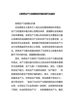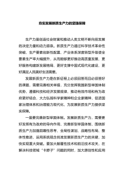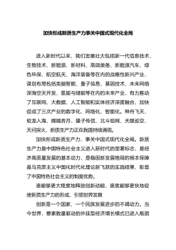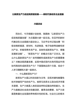 以新质生产力促进高质量发展——新时代推动东北全面振兴座谈会同志们,今天根据计划安排,我围绕“以新质生产力促进高质量发展”为主题跟大家一起交流。在召开的新时代推动东北全面振兴座谈会上,习近平总书记指出要“积极培育新能源、新材料、先进制造、电子信息等战略性新兴产业,积极培育未来产业,加快形成新质生产力,增强发展新动能”。“新质生产力”的概念引发广泛关注。那么什么是新质生产力?如何理解形成新质生产力的重...