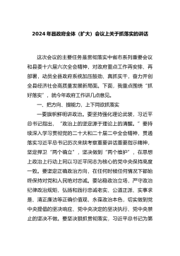 2024年县政府全体(扩大)会议上关于抓落实的讲话这次会议的主要任务是贯彻落实中省市系列重要会议和县委十六届六次全会精神,对政府重点工作再安排、再部署,动员全县政府系统加压鼓劲、真抓实干,奋力开创全县经济社会高质量发展新局面。下面,我重点围绕“抓好落实”,就今年政府工作讲几点意见。一、把方向、提能力,上下同欲抓落实一要旗帜鲜明讲政治。要坚持强化理论武装,习近平总书记指出,“政治上的坚定源于理论上...