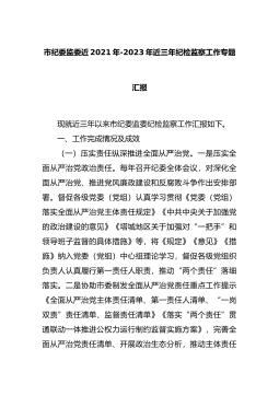 市纪委监委近2021年-2023年近三年纪检监察工作专题汇报现就近三年以来市纪委监委纪检监察工作汇报如下。一、工作完成情况及成效(一)压实责任纵深推进全面从严治党。一是压实全面从严治党政治责任。每年召开纪委全体会议,对深化全面从严治党、推进党风廉政建设和反腐败斗争作出安排部署。督促各级党委(党组)认真学习贯彻《党委(党组)落实全面从严治党主体责任规定》《中共中央关于加强党的政治建设的意见》《...