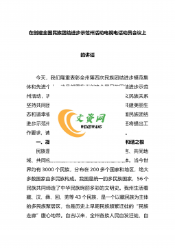 在创建全国民族团结进步示范州活动电视电话动员会议上的讲话今天,我们隆重表彰全州第四次民族团结进步模范集体和先进个人,动员部署我州创建全国民族团结进步示范州活动,巩固发展平等团结互助和谐的社会主义民族关系坚持共同团结奋斗,坚持共同繁荣发展,携手共建美丽生态和谐幸福新甘孜。刚才,舒文同志对创建全国民族团结进步示范州实施意见作了说明,益西达瓦同志还将提出工作要求,请大家认真落实。下面,我讲三点意见。一、...