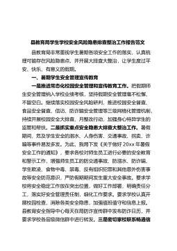 县教育局学生学校安全风险隐患排查整治工作报告范文县教育局非常重视学生暑期各项安全工作的落实,认真梳理可能存在风险隐患点,并开展大排查大整治,让学生度过平安、快乐、有意义的假期。一、暑期学生安全管理宣传教育一是推进常态化校园安全管理和宣传教育工作。把假期师生安全管理纳入学校业绩考核,坚持假期安全管理毫不松懈、不留空白。继续落实校园安全风险研判,推进校园安全督查、食品安全督查、信访、...