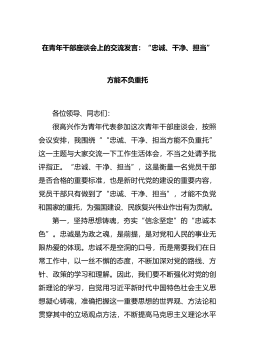 在青年干部座谈会上的交流发言:“忠诚、干净、担当”方能不负重托各位领导、同志们:很高兴作为青年代表参加这次青年干部座谈会,按照会议安排,我围绕““忠诚、干净、担当方能不负重托”这一主题与大家交流一下工作生活体会,不当之处请予批评指正。“忠诚、干净、担当”,这是衡量一名党员干部是否合格的重要标准,也是新时代党的建设的重要内容,党员干部只有做到了“忠诚、干净、担当”,才能不负党和国家...