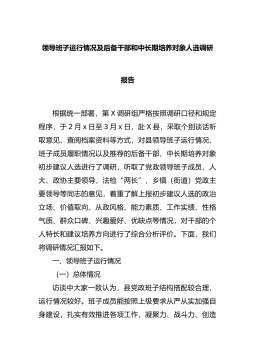 领导班子运行情况及后备干部和中长期培养对象人选调研报告根据统一部署,第X调研组严格按照调研口径和规定程序,于2月x日至3月x日,赴X县,采取个别谈话听取意见、查阅档案资料等方式,对县领导班子运行情况、班子成员履职情况以及推荐的后备干部、中长期培养对象初步建议人选进行了调研,听取了党政领导班子成员,人大、政协主要领导,法检“两长”,乡镇(街道)党政主要领导等同志的意见,着重了解上报初步建议人...