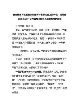 在全区教育发展暨庆祝教师节表彰大会上的讲话:砥砺奋进 担当实干 奋力谱写x教育高质量发展新篇章各位领导、同志们:下面,我主要就如何进一步统一思想、形成共识、夯实举措、凝聚合力,加快推动全区教育事业在新的起点上实现高质量发展先讲几点意见。稍后,市教育局x局长和区委x书记还将作重要讲话,请大家认真学习领会,一并抓好贯彻落实。一、总结经验,发扬成绩,坚定加快教育高质量