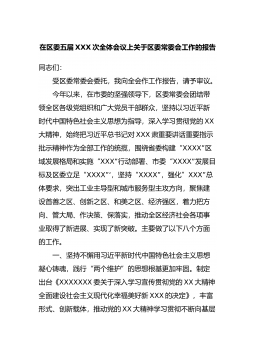 在区委五届XXX次全体会议上关于区委常委会工作的报告同志们:受区委常委会委托,我向全会作工作报告,请予审议。今年以来,在市委的坚强领导下,区委常委会团结带领全区各级党组织和广大党员干部群众,坚持以习近平新时代中国特色社会主义思想为指导,深入学习贯彻党的XX大精神,始终把习近平总书记对XXX肃重要讲话重要指示批示精神作为全部工作的统揽,围绕省委构建“XXXX”区域发展格局和实施“XXX”行...
