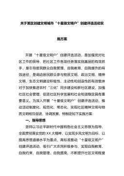 关于某区创建文明城市“十星级文明户”创建评选活动实施方案开展“十星级文明户”创建评选活动,是加强党对社区工作的领导,把社区工作各项任务落实到基层的有效抓手,是引导居民群众自我管理、自我教育、自我提升的有效途径,是调动居民群众参与物质文明、政治文明、精神文明、生态文明建设积极性、主动性和创造性的有效载体对于加快推进农村“三化”同步建设和新社区建设,加强社区社会管理,促进社区科学发展...