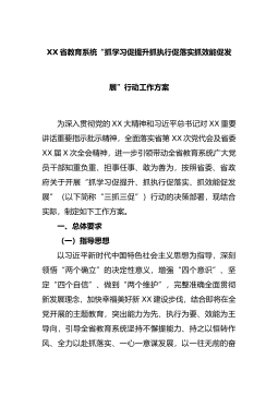 XX省教育系统“抓学习促提升抓执行促落实抓效能促发展”行动工作方案为深入贯彻党的XX大精神和习近平总书记对XX重要讲话重要指示批示精神,全面落实省第XX次党代会及省委XX届X次全会精神,进一步引领带动全省教育系统广大党员干部知重负重、担事任事、敢为善为,按照省委、省政府关于开展“抓学习促提升、抓执行促落实、抓效能促发展”(以下简称“三抓三促”)行动的决策部署,现结合实际,制定如下工...