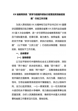 XX省教育系统“抓学习促提升抓执行促落实抓效能促发展”行动工作方案为深入贯彻党的XX大精神和习近平总书记对XX重要讲话重要指示批示精神,全面落实省第XX次党代会及省委XX届X次全会精神,进一步引领带动全省教育系统广大党员干部知重负重、担事任事、敢为善为,按照省委、省政府关于开展“抓学习促提升、抓执行促落实、抓效能促发展”(以下简称“三抓三促”)行动的决策部署,现结合实际,制定如下工...