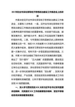 XX市在全市深化领导班子思想政治建设工作推进会上的讲话市委决定召开全市深化领导班子思想政治建设工作推进会,主要有3点考虑:一是,召开全市深化领导班子思想政治建设工作推进会是加强思想政治建设、提高思想理论素养和提升领导能力的重要举措。对武装干部头脑、凝聚发展共识、提升能力水平、推动工作实践发挥了重要而积极的作用。二是,今年是我们党和国家历史上具有特殊重要意义的一年,党的XX大和省第XX次...