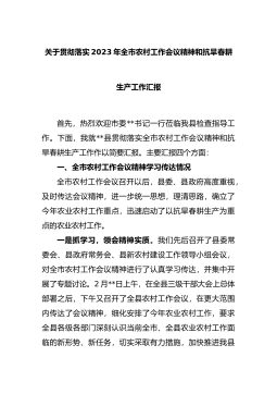 关于贯彻落实2023年全市农村工作会议精神和抗旱春耕生产工作汇报首先,热烈欢迎市委**书记一行莅临我县检查指导工作。下面,我就**县贯彻落实全市农村工作会议精神和抗旱春耕生产工作作以简要汇报。主要汇报四个方面:一、全市农村工作会议精神学习传达情况全市农村工作会议召开以后,县委、县政府高度重视,及时传达会议精神,进一步统一思想,理清思路,确立了今年农业农村工作重点,迅速启动了以抗旱春耕生产为重点...