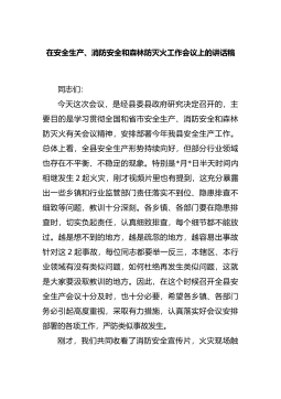 在安全生产、消防安全和森林防灭火工作会议上的讲话稿同志们:今天这次会议,是经县委县政府研究决定召开的,主要目的是学习贯彻全国和省市安全生产、消防安全和森林防灭火有关会议精神,安排部署今年我县安全生产工作。总体上看,全县安全生产形势持续向好,但部分行业领域也存在不平衡、不稳定的现象。特别是*月*日半天时间内相继发生2起火灾,刚才视频片里也有提到,这充分暴露出一些乡镇和行业监管部门责任落实不到位、隐...