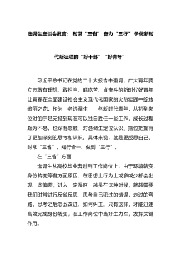 选调生座谈会发言:时常“三省”奋力“三行”争做新时代新征程的“好干部”“好青年”习近平总书记在党的二十大报告中强调,广大青年要立志做有理想、敢担当、能吃苦、肯奋斗的新时代好青年让青春在全面建设社会主义现代化国家的火热实践中绽放绚丽之花。作为一名选调生,一名新时代青年,从初到岗位时的手足无措到现在可以独自胜任一些工作,成长过程颇为不易,也深有感触,对选调生定位认识、摆位把握有了...