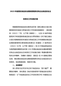 2023年县落实食品安全属地管理责任和企业食品安全主体责任工作实施方案根据国务院食品安全委员会印发《建立健全分层分级精准防控末端发力终端见效工作机制实施细则》(食安委发〔2022〕7号,以下称《细则》),以及XX省市场监管局关于转发国务院食品安全办贯彻落实《关于建立健全分层分级精准防控末端发力终端见效工作机制推动食品安全属地管理责任落地落实的意见》的通知(X食药安办〔2022〕54号,以下...