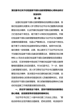 2023纪检监察干部队伍教育整顿专题学习研讨心得体会发言材料(3篇)(一)全国纪检监察干部队伍教育整顿动员部署会议强调,各级纪检监察机关要深入学习贯彻习近平总书记重要讲话和重要指示批示精神,扎实开展纪检监察干部队伍教育整顿,着力打造忠诚干净担当、敢于善于斗争的纪检监察铁军。开展纪检监察干部队伍教育整顿是贯彻落实习近平总书记重要讲话精神的重要举措,也是从严整肃队伍,打造忠诚干净担当、敢于善于斗争...