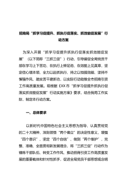 招商局“抓学习促提升、抓执行促落实、抓效能促发展”行动方案为深入开展“抓学习促提升抓执行促落实抓效能促发展”(以下简称“三抓三促”)行动,引导督促全局党员干部在学习上下苦功、在执行上钾足劲、在效能上见真章,坚定信心增本领、全力以赴抓执行、持之以恒提效能、坚持不懈强作风、踏实苦干建新功,以实际行动助推全市招商引资工作高质量发展。现根据《XX市“抓学习促提升抓执行促落实抓效能促发展”行动实施方案》要...