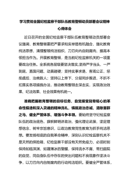 学习贯彻全国纪检监察干部队伍教育整顿动员部署会议精神心得体会近日召开的全国纪检监察干部队伍教育整顿动员部署会议强调,教育整顿要把严要求和实举措有机融合,强化教育纯洁思想,清理整顿纯洁组织,刀刃向内自剜腐肉,提高本领担当作为。开展教育整顿,是当前纪检监察机关的一项重要政治任务。全系统各层级要坚决落实,坚持严字当头、一严到底,直面问题、动真碰硬;坚持实事求是、客观公正,惩前處后、治...