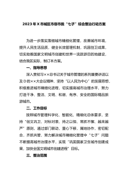 2023年X市城区市容市貌“七子”综合整治行动方案为进一步落实落细城市精细化管理,改善城市环境,提升人民生活品质,健全长效管理机制,巩固创卫成果,切实助推国家文明城市创建和世界一流旅游目的地建设,结合我区实际,制订本方案。一、指导思想深入贯彻习××总书记关于城市管理的系列重要讲话以及D的××大会议精神,坚持“以人民为中心”的发展思想,积极推进城市精细化进程,切实提高城市治理水平,努力打造干净、整...