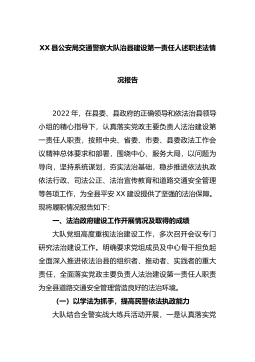 XX县公安局交通警察大队治县建设第一责任人述职述法情况报告2022年,在县委、县政府的正确领导和依法治县领导小组的精心指导下,认真落实党政主要负责人法治建设第一责任人职责,按照中央、省委、市委、县委政法工作会议精神总体要求和部署,围绕中心、服务大局,以问题为导向,坚持系统谋划,夯实法治基础,稳步推进依法执政依法行政、司法公正、法治宣传教育和道路交通安全管理等各项工作,为全县平安...