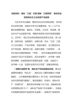 经验材料:强化“三品”引领赋能“三链同构”推动农业优势转化为工业优势产业胜势 习近平总书记强调,要依托农业农村特色资源,向开发农业多种功能、挖掘乡村多元价值要效益,向一二三产业融合发展要效益,强龙头、补链条、兴业态、树品牌,推动乡村产业全链条升级,增强市场竞争力和可持续发展能力。近年来,*县以农业供给侧结构性改革为主线,深入实施“品种改良、品质提升、品牌打造”农业“三品”工...