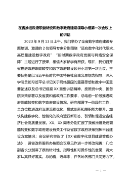 在省推进政府职能转变和数字政府建设领导小组第一次会议上的讲话2023年9月13日上午,我们举办了全省数字政府建设专题培训,邀请的2位领导专家分别围绕“适应数字化时代要求,高质量建设数字政府”“新时期数字政府发展与网络安全保障”主题进行了授课,相信大家都学有所获。现在,我们召开省推进政府职能转变和数字政府建设领导小组第一次会议,主要任务是以习近平新时代中国特色社会主义思想为指导,深入学习贯彻习...