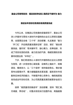 基金公司领导发言:锚定目标争进位真抓实干善作为奋力推进全年目标任务高标准高质量完成今年以来,在集团公司党委的坚强领导下,基金公司深入开展学习贯彻A新时代中国特色社会主义思想主题教育,全面落实全省“三个年”活动部署,扎实推进“奋力‘开门红’开启高质量发展新征程”活动,紧盯“增业绩提效益、强作风”等关键环节,凝心聚力、改革创新,形成了项目攻坚的优势、奋力担当的气势、稳健发展的态势...