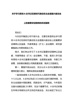 关于学习贯彻A总书记在新时代推动东北全面振兴座谈会上的重要讲话精神的讲话提纲同志们:今天召开集团公司干部大会,主要任务是传达学习贯彻A总书记在新时代推动东北全面振兴座谈会上的重要讲话精神以及省委、市委常委会(扩大)会议精神,研究部署集团公司贯彻落实工作。刚才,我们传达学习了A总书记重要讲话精神以及省委、市委常委会(扩大)会议精神。下面,就深入学习宣传贯彻A总书记...