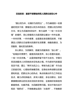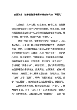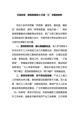 交流发言:坚定理想信念牢记为民宗旨奋力开创新时代退役军人事务工作新局面这次全区学习贯彻党的二十大精神专题研讨班既是一次党课教育,也是一次集中培训,既是政治理论水平的大提升,也是做好新时代退役军人事务工作、重整行装再出发的总动员。通过学习领会市委书记的辅导报告,深刻领悟全面从严治党,加强党的建设等重要论述,让我对团结奋斗有了更深层次的理解,具体我有以下几点体会:一是要强化“万山磅...