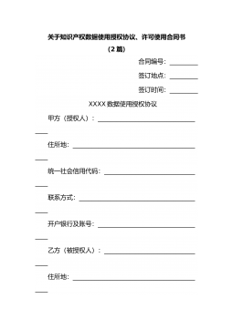 关于知识产权数据使用授权协议、许可使用合同书(2篇)合同编号:_________签订地点:_________签订时间:_________XXXX数据使用授权协议甲方(授权人):___________________________________住所地:___________________________________________统一社会信用代码:____________________...