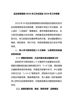 区应急管理局2023年工作总结及2024年工作思路2023年XX区应急管理局坚决贯彻落实区委区府及市应急管理局各项决策部署,坚持稳中求进工作总基调,深入践行“人民城市”重要理念,更好统筹发展和安全,全力防范化解重大安全风险,持续推进应急管理体系和能力现代化,有力防御台风暴雨等自然灾害,坚决遏制重特大事故,踔厉奋发、笃行不怠,持续保障城区运行安全平稳有序。一、深入学习贯彻党的二十大精神,...