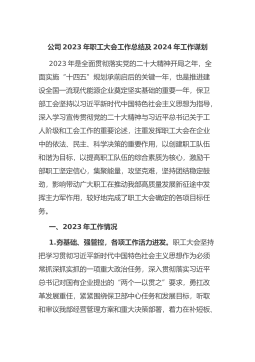 公司2023年职工大会工作总结及2024年工作谋划2023年是全面贯彻落实党的二十大精神开局之年,全面实施“十四五”规划承前启后的关键一年,也是推进建设全国一流现代能源企业奠定坚实基础的重要一年,保卫部工会坚持以习近平新时代中国特色社会主义思想为指导,深入学习宣传贯彻党的二十大精神与习近平总书记关于工人阶级和工会工作的重要论述,注重发挥职工大会在企业中的依法、民主、科学决策的重要作用,以...