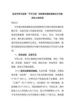 在全市学习运用“千万工程”经验暨巩固衔接重点工作推进会上的讲话同志们:今年是巩固拓展脱贫攻坚成果同乡村振兴有效衔接的关键之年,当前已进入年度收官阶段,中省考核评估在即,各项任务繁重,形势不容乐观。一会儿,书记、市长还要讲话,请大家认真领会,切实抓好贯彻落实。下面,我就省市相关会议精神作以传达,并就贯彻落实会议精神、推进巩固脱贫攻击成果同乡村振兴有效衔接工作先讲几点意见。一、肯定...