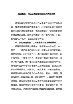 交流发言:树立正确政绩观助推高质量发展通过认真学习习近平总书记关于树立和践行正确政绩观、推动高质量发展的重要论述,我深刻领会到正确政绩观的丰富内涵和实践要求,也深刻理解了“政绩为谁而树树什么样的政绩、靠什么树政绩”这一重大问题。下面,我结合*工作实际,谈谈三点学习体会。一、强化政治监督,以纠偏定向引领正确政绩观领导干部政绩观出现偏差,不仅影响一个地区、一个部门、一个单位事业的顺...