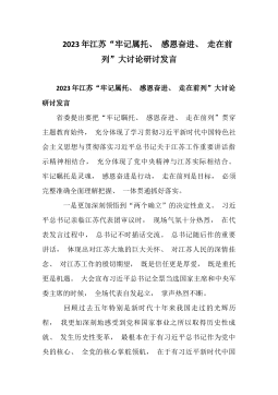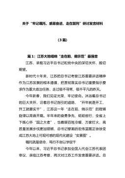 关于“牢记嘱托、感恩奋进、走在前列”研讨发言材料(3篇)篇1:江苏大地唱响“走在前、做示范”最强音江苏,承载习近平总书记和党中央的深切关怀、殷切期望。新时代十年来,江苏把总书记考察江苏重要讲话精神作为江苏发展的根本遵循,把贯彻落实总书记重要指示要求作为重大政治任务,走过极不寻常、极不平凡的昨天。今年新春,我们见证光荣、牢记使命。沐浴着总书记的巨大关怀,沿着总书记指引的道路,“开年就是开工、开工就要...