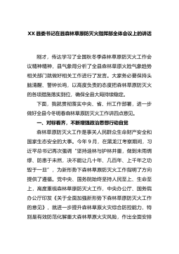 XX县委书记在县森林草原防灭火指挥部全体会议上的讲话刚才,传达学习了全国秋冬季森林草原防灭火工作会议精神精神,县气象局分析了全县森林草原火险气象趋势相关部门就做好相关工作进行了发言。大家务必要保持头脑清醒、警钟长鸣,以高度负责的态度把森林草原防灭火的各项措施落实到位,确保全县大局持续稳定。下面,我就贯彻落实中央、省、州工作部署,进一步做好全县今冬明春森林草原防灭火工作讲四点意见。一、对标看齐,不...