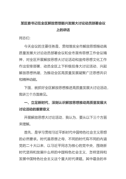 某区委书记在全区解放思想振兴发展大讨论动员部署会议上的讲话同志们:今天会议的主要任务是,贯彻落实全市解放思想推动高质量发展大讨论动员部署会议和全市宣传思想工作会议精神,对全区开展解放思想大讨论活动和宣传思想文化工作作出安排部署,动员全区上下积极投身大讨论活动,兴起解放思想热潮,为推动全区高质量发展凝聚广泛思想共识和精神动能。下面,就抓好全区解放思想推进高质量发展大讨论活动,我讲三个方面意见。一、立...