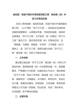 县实施“百县千镇万村高质量发展工程”推动镇(街)村抓工作落实机制 为深入贯彻省委、省政府实施“百县千镇万村高质量发展工程”(以下简称“百千万工程”)促进城乡区域协调发展的部署要求,认真落实市委、市政府和县委、县政府全面落实“百千万工程”工作安排,进一步推动“百千万工程”重点工作、重点项目在镇(街)村落地见效,在“周调度、月通报、季推进、年考评”工作制度(试行)基础上,县“百千万...