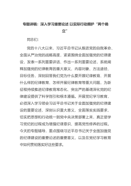 专题讲稿:深入学习重要论述以实际行动拥护“两个确立”同志们:党的十八大以来,习近平总书记从推进党的自我革命、全面从严治党的战略高度,紧紧围绕全面加强党的纪律建设,发表一系列重要讲话、作出一系列重要论述,系统阐释加强党的纪律教育的重大意义、内容对象、方法途径、目标任务,深刻回答我们党为什么要开展纪律教育、开展什么样的纪律教育、怎样开展纪律教育等重大问题,为新征程持续推进纪律教育常态化、突出严的基调...
