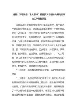 讲稿:学思践悟“七大思维”精髓要义引领推动新时代政法工作行稳致远注重运用科学的思维方法认识和改造世界,是中国共产党在领导中国革命、建设和改革实践中的一个鲜明特征。党的十八大以来,习近平总书记围绕涵养与运用科学思维方法先后发表了一系列重要论述,深刻回答了什么是科学思维、为什么要增强科学思维、如何提高科学思维能力等重大理论和实践问题。习近平总书记在党的XX大报告中强调,要“不断提高战略思维、历史思...