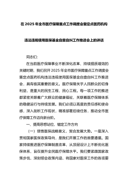 在2025年全市医疗保障重点工作调度会暨定点医药机构违法违规使用医保基金自查自纠工作推进会上的讲话同志们:在当前医疗保障事业不断深化改革、持续提质增效的关键时期,我们召开2025年全市医疗保障重点工作调度会暨定点医药机构违法违规使用医保基金自查自纠工作推进会,具有极其重要的意义。医疗保障关乎人民群众的切身利益,是重大的民生工程、民心工程。每一项工作的推进都紧密关联着广大群