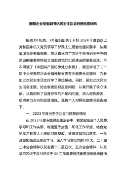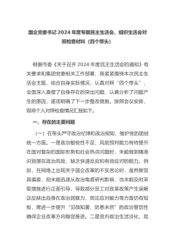 国企党委书记2024年度专题民主生活会、组织生活会对照检查材料(四个带头)根据市委《关于召开2024年度民主生活会的通知》有关要求和集团党委相关工作部署,我紧紧围绕本次民主生活会主题,结合自身实际情况,认真对照“四个带头”,全面深入查摆了自身存在的突出问题,认真分析了问题产生的原因,逐项明确了下一步整改措施。按照会议安排,现将个人对照检查情况汇报如下。一、存在的主要问题(
