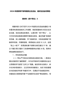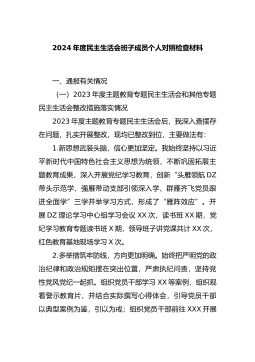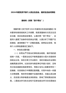 2024年度党员干部个人民主生活会、组织生活会对照检查材料(对照“四个带头”)根据市委《关于召开2024年度民主生活会的通知》有关要求和局党组相关工作部署,我紧紧围绕本次民主生活会主题,结合自身实际情况,认真对照“四个带头”,全面深入查摆了自身存在的突出问题,认真分析了问题产生的原因,逐项明确了下一步整改措施。按照会议安排,现将个人对照检查情况汇报如下。一、存在的主要问题