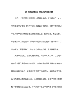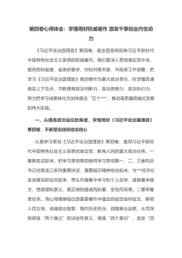 第四卷心得体会:把握精髓要义感悟思想伟力全力推进社会主义现代化建设《习近平谈治国理政》第四卷,生动记录了面对百年变局和世纪疫情相互叠加、世界进入新的动荡变革期的复杂局面,以习近平同志为核心的党中央团结带领全党全国各族人民应变局开新局的伟大实践,汇集了一系列原创性的治国理政新理念新思想新战略,为我们走好实现第二个百年奋斗目标新的赶考之路指明了前进方向、提供了根本遵循。我们要认真学习...